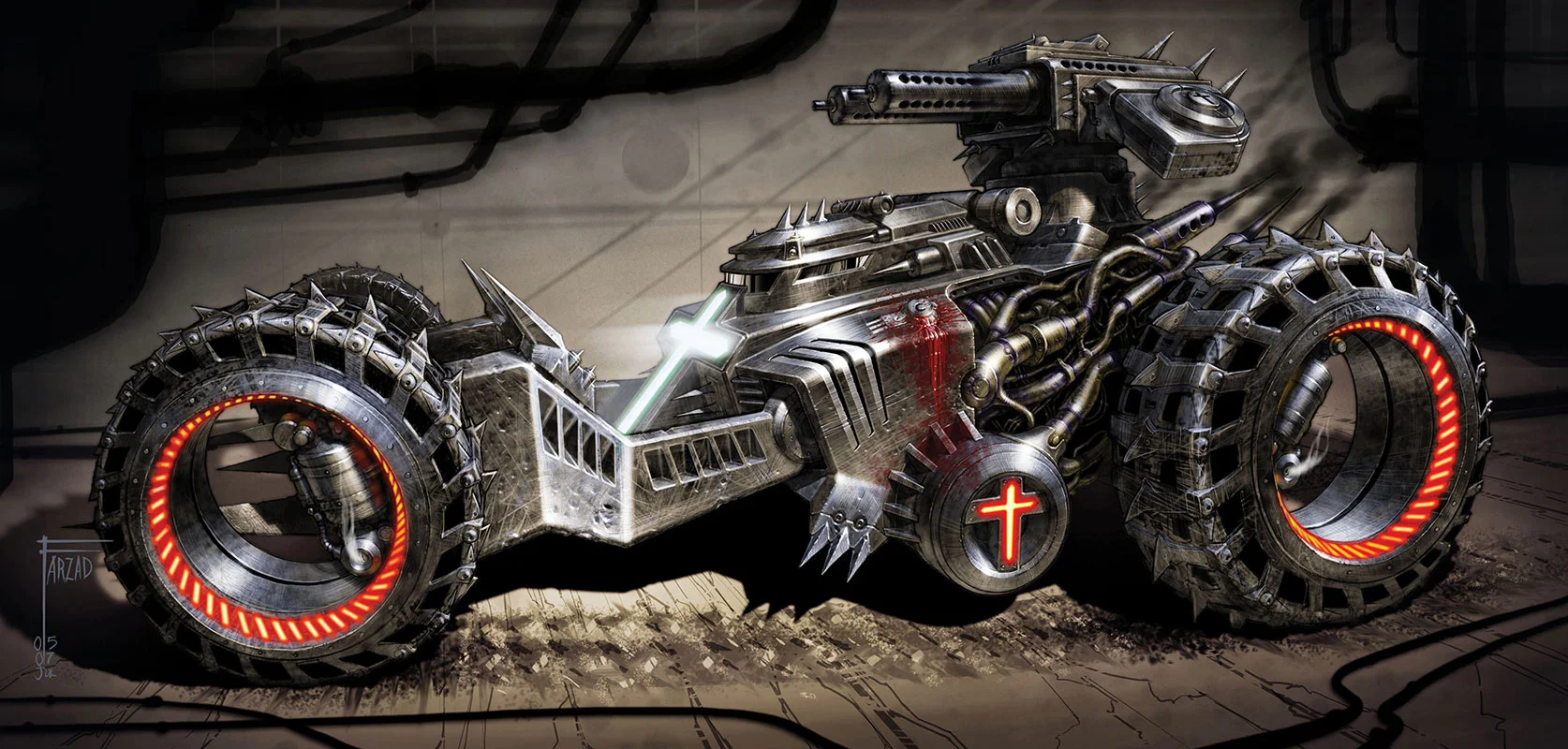 I'm able to show you only a few key images from the preproduction. The Darkwatch Hellion is designed for combat against the vampires, and it is specifically built out of a super strong silver alloy. The vehicle features a deadly glowing cross on each of it's faces, including the undercarriage. Nearly every exposed edge is sharpened for maximum damage. The Infernal Engine is fueled by high octane vampire blood. The Hellion's only purpose is to KILL blood suckers.